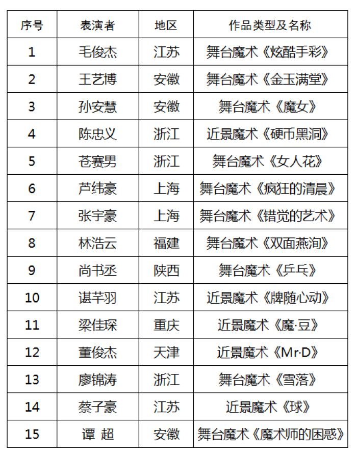 第十五届金手杖奖魔术比赛报名工作启动以来,共收到来自全国13个省(直辖市)以及香港特别行政区28人次有效报名。